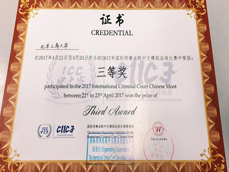 2017年4月21日至4月23日,公司组队参加了2017年国际刑事法院中文模拟法庭比赛——瓦拉利亚情势,此次比赛由颜苏和剌森两位老师作为指导老师,在全体参赛人员的共同努力下,经过激烈角逐,公司最终取得了三等奖的好成绩。