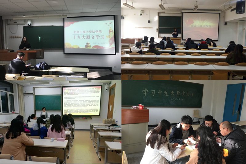 各员工支部纷纷开展了“读原文谈感受”活动。阜成路校区本科党支部、16研法律非法学党支部、17研法学党支部纷纷开展了多种形式的诵读十九大报告原文活动。诵读十九大报告原文的学习形式新颖、效果实在,既提升了深入学习的积极性,又帮助理解掌握了报告的精髓要义、基本要点和核心要求。学院团总支召开了“牢记使命共奋斗,青春喜迎十九大”——学习党的十九大精神座谈会,会上团学干部们畅谈自己对于十九大精神的理解,在交流与分享中深化对十九大的认识。