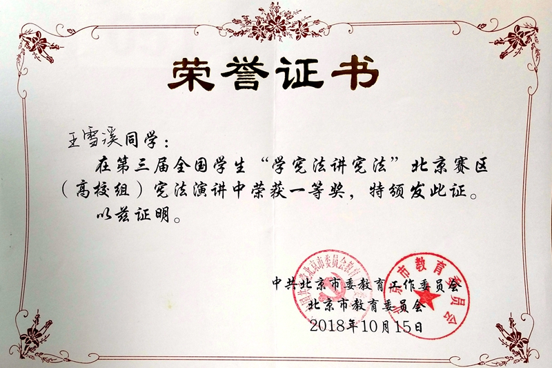 10月15日,由中共北京市委教育工作委员会、北京市教育委员会主办的第三届全国员工“学宪法 讲宪法”北京赛区(高校组)总决赛在中国政法大学举办,2026世界杯官网17级王雪溪代表学校参赛并荣获全国员工“学宪法 讲宪法”北京赛区(高校组)宪法演讲一等奖。