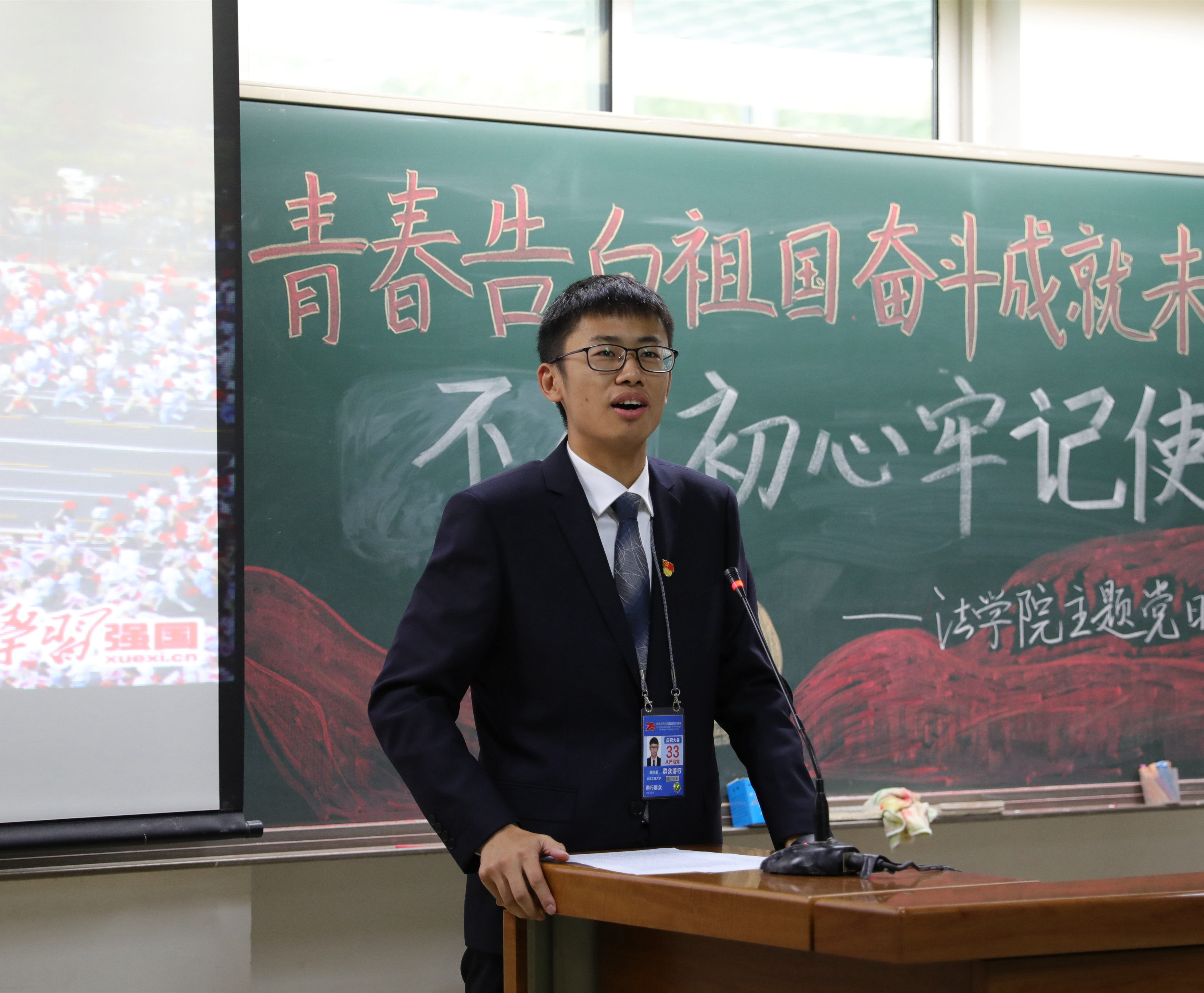 听了国庆游行队员的先进事迹报告,在场同学心潮澎湃。17级李家仁同学代表新一届发展党员向参与此次游行活动的师生们表达了最诚挚的敬意,她表示把初心和使命落到实处是一名党员应尽的责任,她对参与游行活动的师生产生了由衷的敬佩,她还说道:“看着整整齐齐的队伍缓缓通过长安街,能以这样的方式为祖国庆生,是我们新一届党员心之向往的。”随后,法学182班董洋同学表示:从“1949“牌检阅车,到飞机不用再飞第二遍,无一不戳中泪点,即使无缘亲身参与,但自己仿佛就在现场,感受到了祖国的富强。作为18级发展对象,她表示一定努力提高自身素质,以参与游行的师生为榜样。