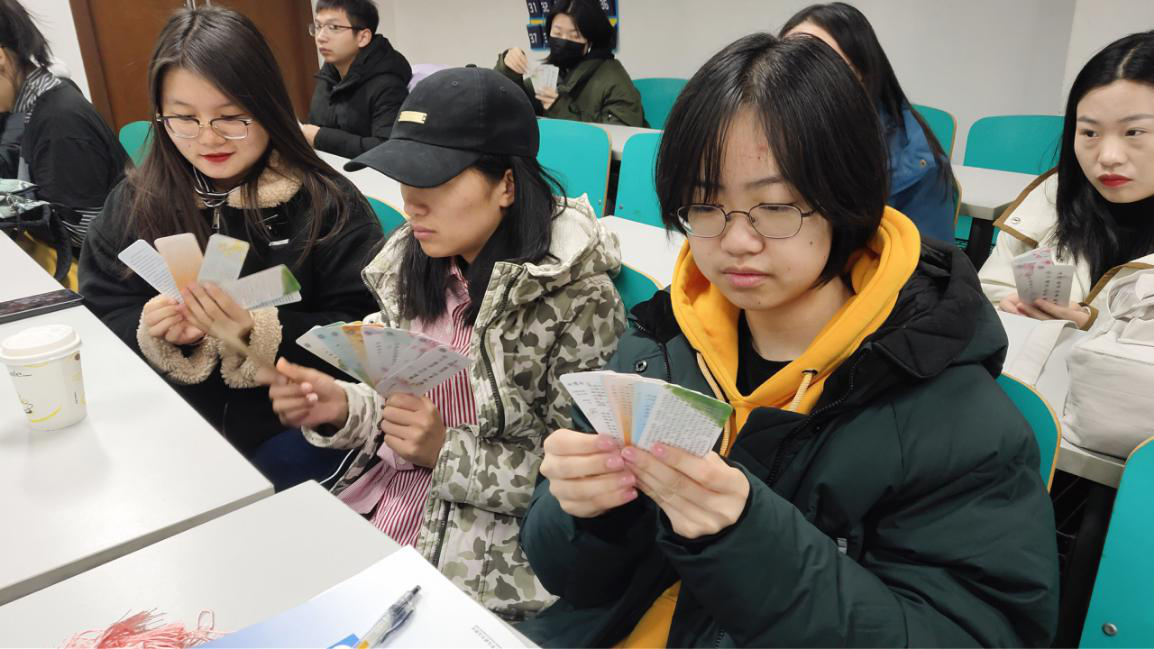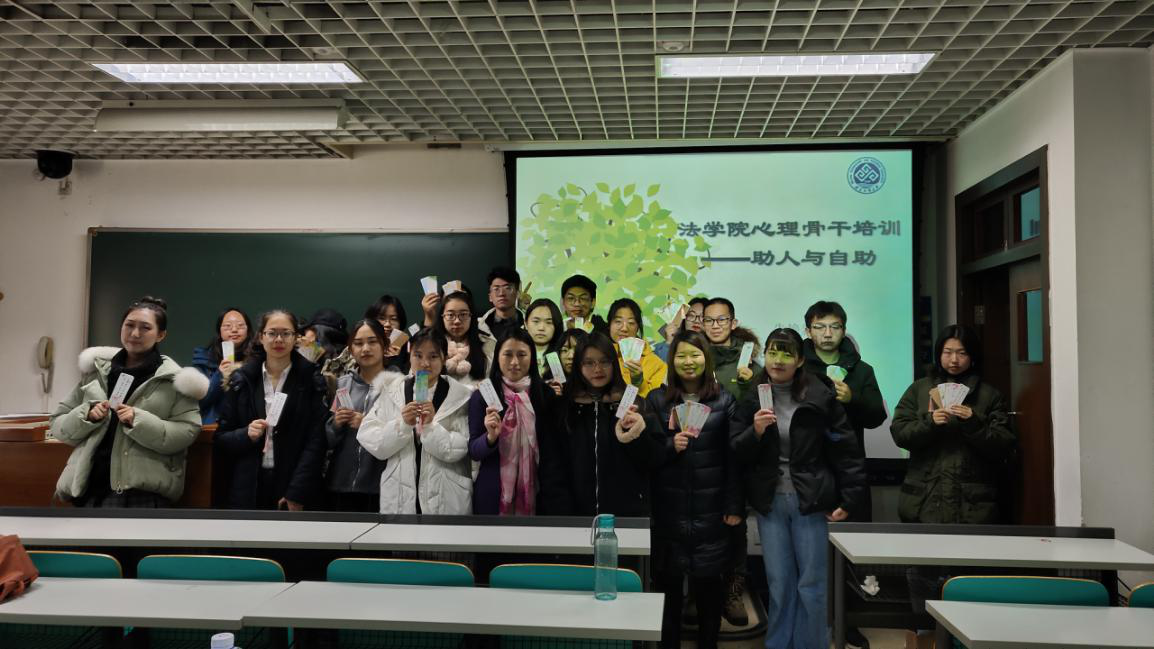 本次讲座分为两个部分,第一部分主要围绕作为心理骨干应当如何帮助身边的同学解决心理问题以及遇到了心理问题该如何应对开展讲座。第二部分,与心理骨干探讨心理知识的宣传方法与途径,利用此次PPT组织班里开展班会。心理骨干应当注重维护自身的心理健康,保持乐观向上的积极心态,发现问题及时解决。及时关注班级同学的心理状况,对心理有困惑的同学进行耐心开导,帮助其走出困境。很多人都会在某个阶段感觉到生活、学习等方面出现了一些困难。在身边的同学有反常的行为时,应当及时进行关心和询问,帮助他们共同解决问题。讲座结束后,朱老师也给各位参与培训的心理骨干发放了心理方面的书签作为纪念。