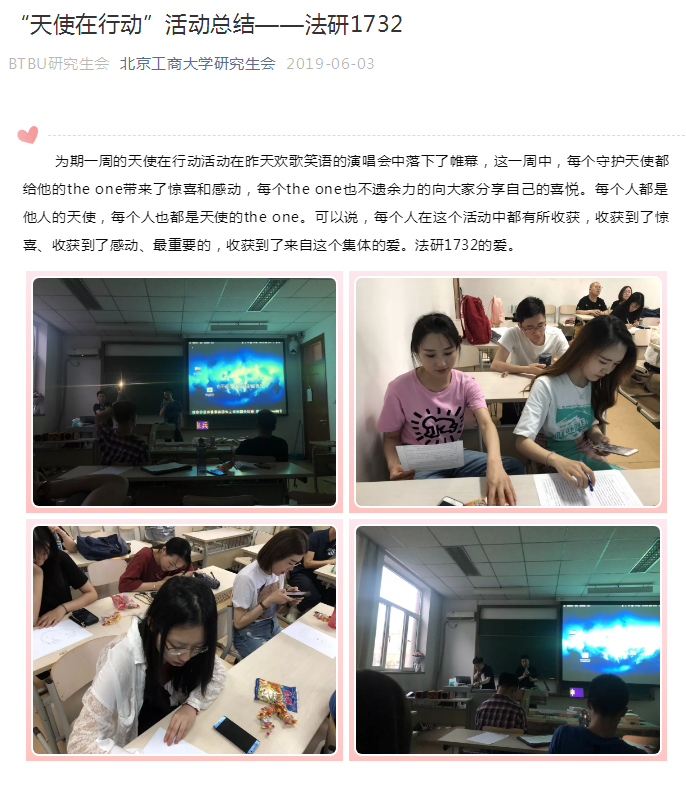 4月16日至5月31日,学院在本科生新生4个班级和研究生7个班级中开展“天使在行动——班级主题活动”。在为期一周的时间里,每个人通过天使和The One 的角色,去体验和关注觉察自我和他人的情绪及变化,通过活动缓解消极情绪,体验积极情绪,同时通过班级心理委员(大天使)带领班级员工进行“情绪管理”团体辅导游戏,帮助老员工学会积极应对压力和烦恼,有效管理情绪、提升心理效能,以理性平和、积极阳光的心态面对老员工活,通过班级同学间的互动也达到增进同学间感情、增强班级凝聚力的作用。天使在行动活动取得了良好的活动效果,活动对象范围广泛,参与程度高,共12个班级约300人踊跃参加。同学们表示:通过在班级内开展活动,宿舍内部关系也更为融洽,各宿舍同学在给别人送去爱心的同时,对自己的室友更是多了几分关怀。天使活动是我参加的活动里面最新奇的,在被关爱的同时也关爱别人,同时拉进了同学之间的关系。有的班级表示:参加了这次的天使在行动,我觉得这个活动最大的意义在于让每个人学会如何关心他人,收获全新的友谊。