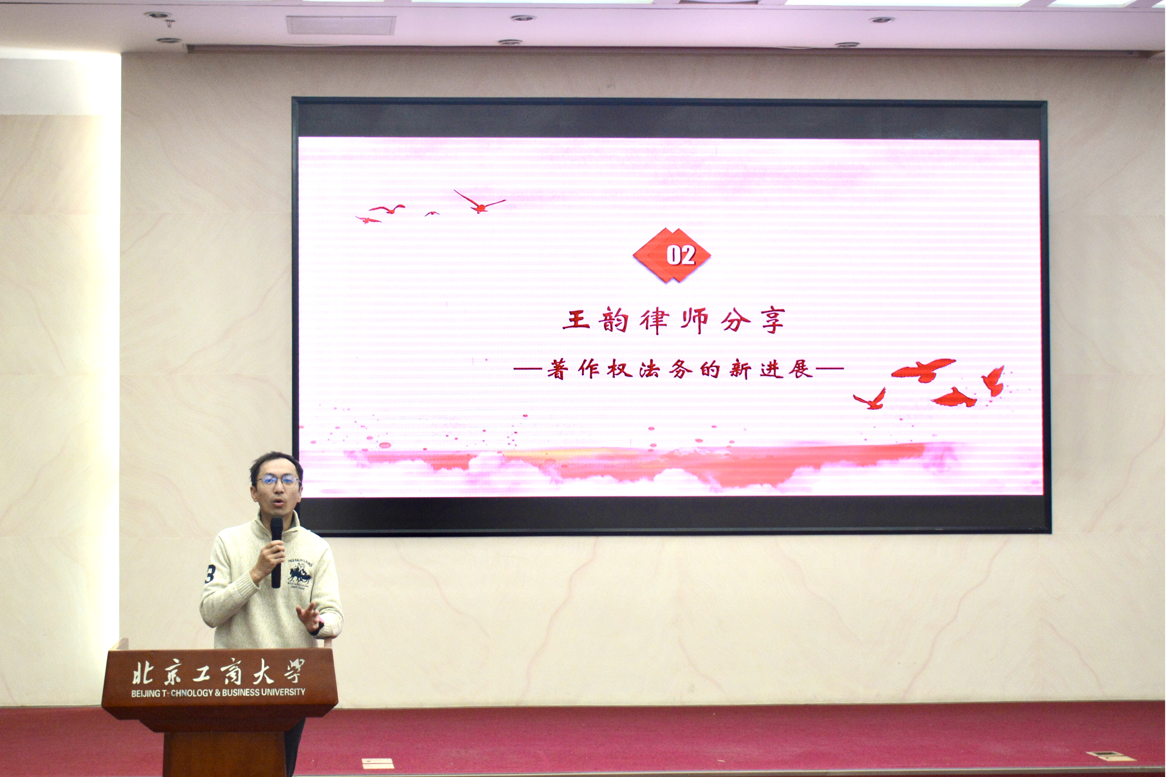 活动第二环节是主题分享环节。北京市中永律师事务所合伙人、北京市律协著作权法专业委员会主任、公司99届本科毕业生王韵律师分享主题是“著作权法务的新进展”。王韵律师介绍了著作权纠纷领域的经典案例,并结合自己二十年的著作权法务从业经验,给同学们提了两点建议:第一,法学是一门实践性很强、需要积累经验的学科,因此建议同学们在学好专业课的基础上,也要了解行业,选择适合自己的舞台,在实践中不断提升自己;第二,希望同学们选择自己能够坚持的行业,一心一意地做下去。王律师表示,选择一个合适的行业很重要,他之所以能够在著作权法务领域坚持二十年就是因为他认为这个领域很有趣,每天面对新的东西,能够满足不断求知的欲望。他鼓励同学们培养自己的专业素养和职业技能,提高自身的综合素质和核心竞争力,在磨练中收获成长。