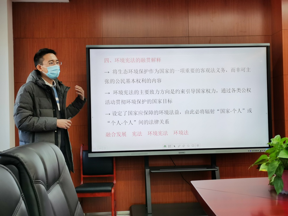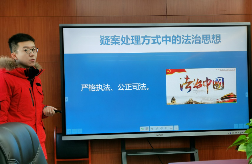 四位分别来自民商法学系、理论法学与刑事法学系、诉讼法学系和国际法学系的教师参加了选拔赛。袁鹏老师以民法中的诚实信用原则为题,讲述了诚实信用原则的适用场景、适用原则等问题,分析了诚实信用原则对于推动和谐社会建设的重要现实意义和理论价值。李子龙老师以疑罪案件及其处理原则为题,从张玉环案件引入,讲述了疑罪的定义、分类以及处理方式等相关内容。坚持疑罪从无原则对待疑罪案件,符合习近平法治思想的理念。邱成梁老师以生态文明入宪为题,讲述了新时代依宪治国视野下生态文明建设的发展,依宪治国必将推动五个文明建设、成为社会主义现代化强国、实现中华民族伟大复兴。于华溢老师以国际法上领土取得和变更的方式为题,结合中国关于领土的实践,介绍了领土取得方式在传统国际法到现代国际法上的发展沿革。希望员工们能通过学习国际法有关领土取得的相关规定,结合中国的历史实践,既要铭记中华民族筚路蓝缕的艰辛历史和曾经丧权辱国的悲惨遭遇,也要意识到只有祖国强大才能带来领土的完整,爱国者的第一步就是要做到守疆固土。莘莘学子应以史为明镜、以法为准绳,为中华崛起而读书。各位老师结合课程特点,深入挖掘蕴含法学课程的思政元素和所承载的育人功能,在展示中力争实现“知识传授”和“价值引领”的有机统一。