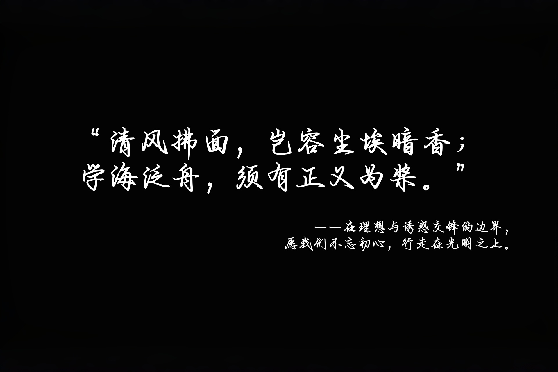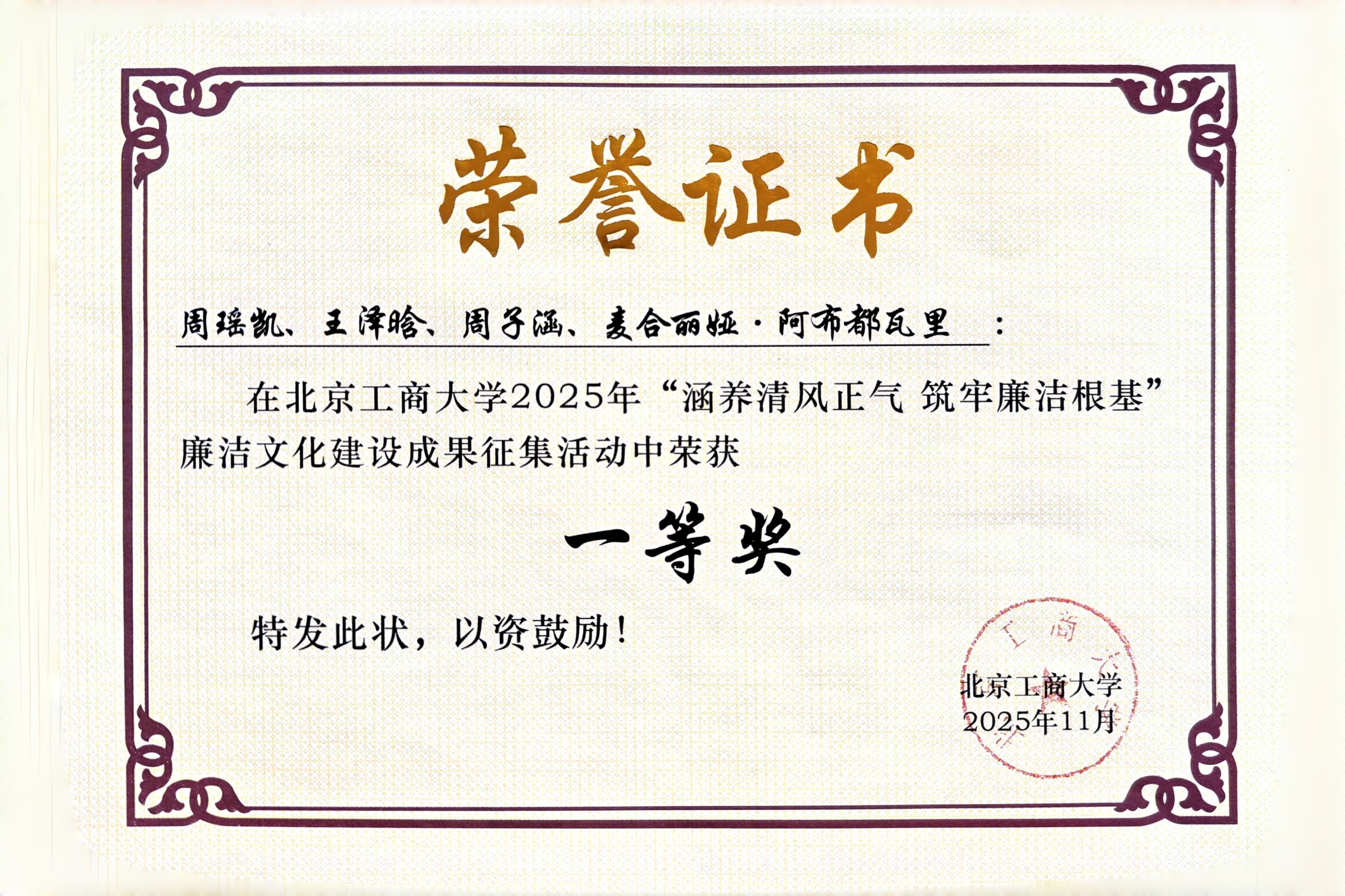 周瑶凯、王泽晗、周子涵、麦合丽娅・阿布都瓦里创作的《员工的名义》获校级一等奖和北京市廉洁文化作品创意奖。作品以党的十八大后反腐斗争为时代背景,以高校校园为社会微观缩影,聚焦员工组织权力运行机制,通过还原员工干部工作中的 “人情往来”、活动获奖评审、综合测评加分等关键场景,精准呈现权力运行中的博弈与“微腐败”表现。作品以贴近员工生活的叙事逻辑,展现了责任、义务与权力的价值碰撞,既呼应了新时代反腐工作的核心要求,也深刻诠释了廉洁文化建设在校园场景中的现实意义,为高校廉洁教育提供了生动实践案例。