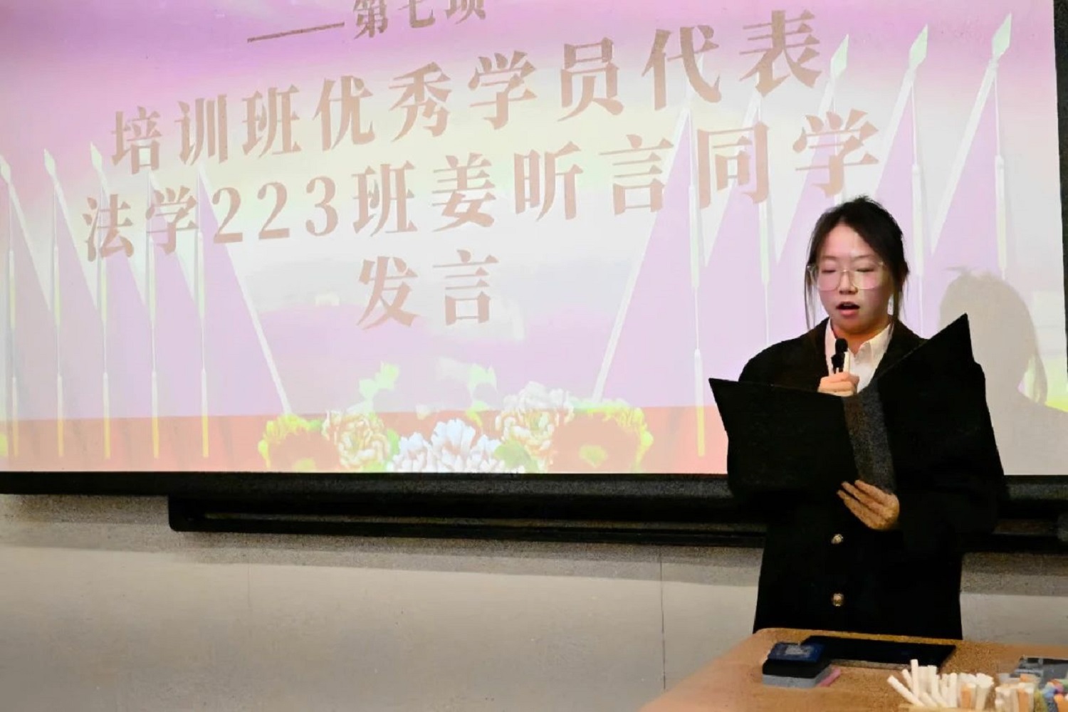 培训班优秀学员代表姜昕言同学进行发言,她表示,在团校学习期间,收获颇丰。在老师的讲座中,她更加全面客观的了解到夯实文化自信之基的重要性。在北大红楼中,增强了责任感和使命感,也进一步明确了青春的奋斗方向。最后她表示作为共青团员,将继续努力,在新时代新征程中追求理想,勇攀高峰。