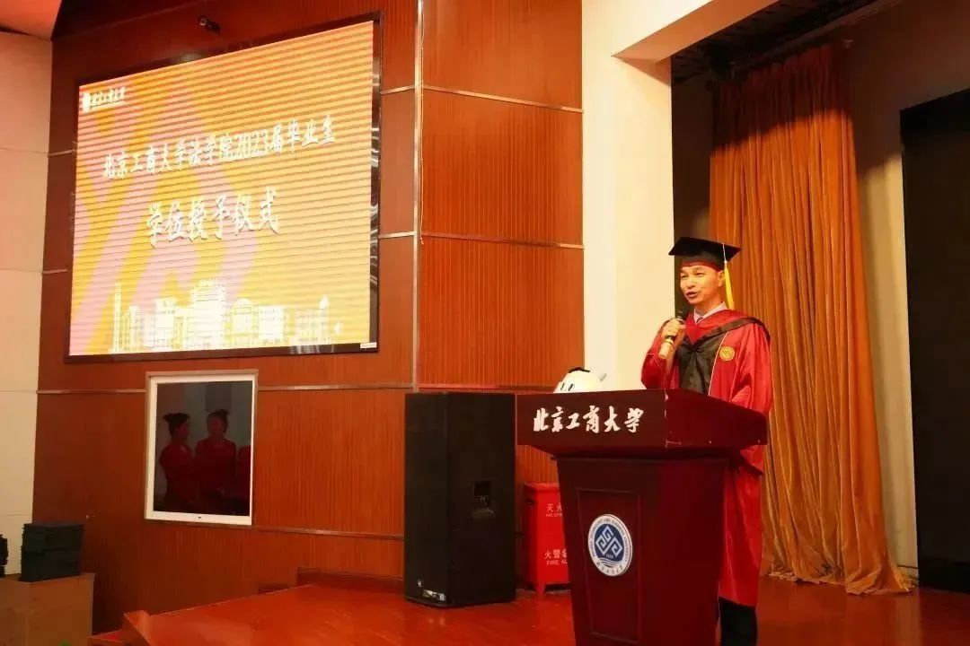 原本科第二员工党支部书记邹颖凡、原院研究生员工会主席周震作为优秀毕业生代表上台发言,他们表达了对母校悉心培养的诚挚感激和对学校宏图更展、再谱华章的美好祝愿。他们希望同学们将“求真、立德、勤奋、创新”的校训铭记在心,明德尚法、笃行致公,永葆北工商法律人的社会责任感与使命感,并祝福母校和学院在未来蒸蒸日上、蓬勃发展。