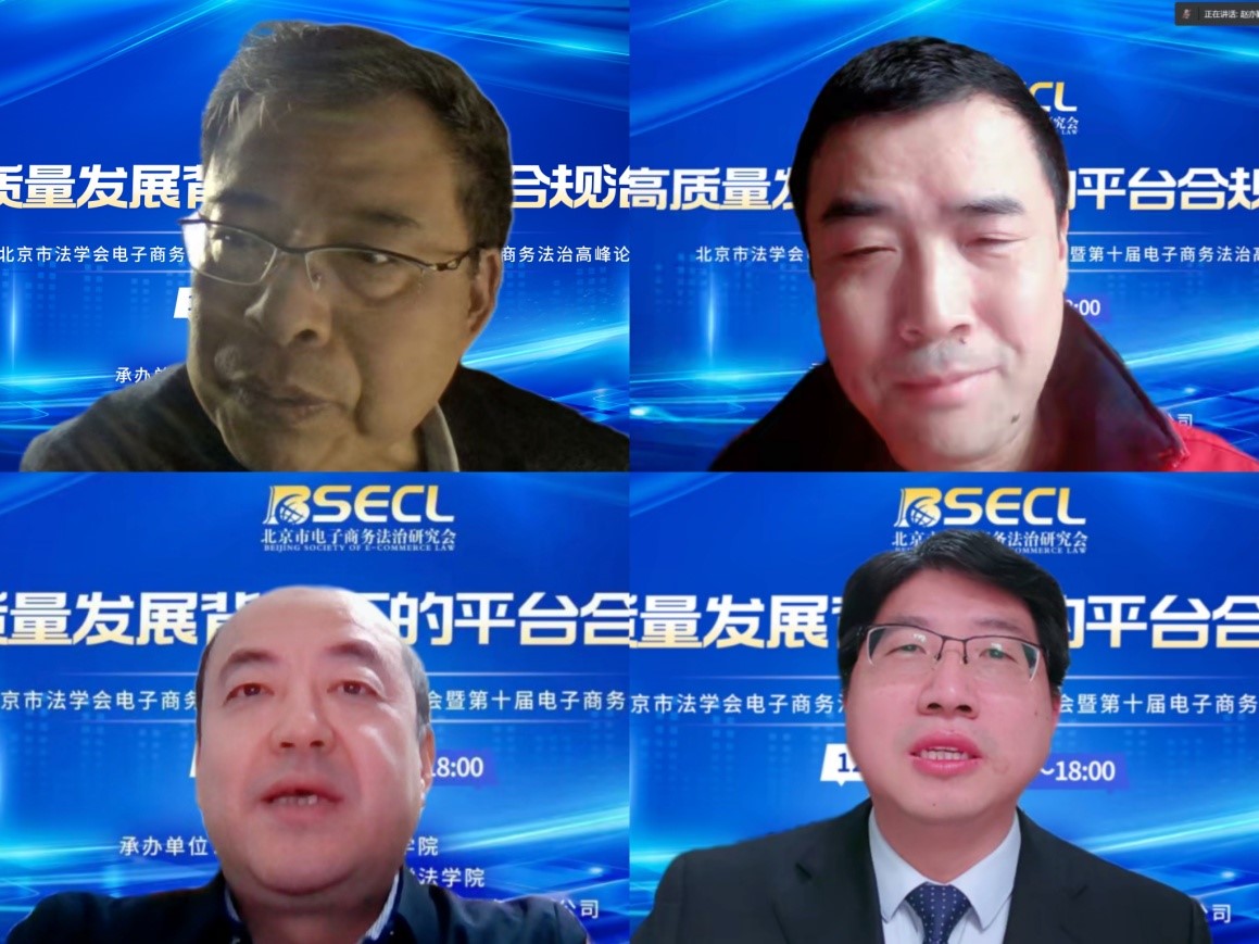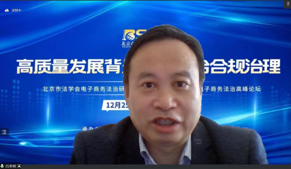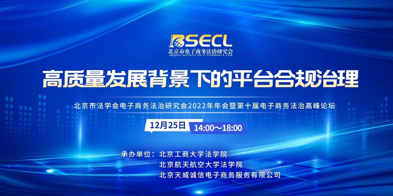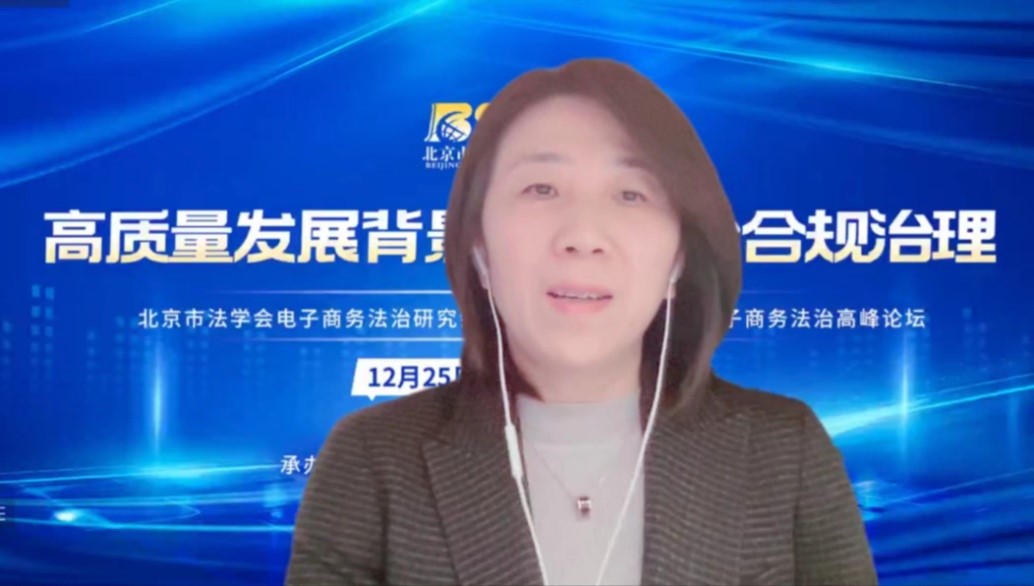 12月25日,由北京市法学会电子商务法治研究会主办,公司2026世界杯官网等单位承办北京市法学会电子商务法治研究会2022年年会暨第十届电子商务法治高峰论坛成功举办。来自国家市场监管总局、北京大学、清华大学、中国人民大学、中国政法大学、上海交通大学、北京师范大学、北京航空航天大学、北京外国语大学、对外经济贸易大学、北京互联网法院、北京市消费者协会、中国市场监管报社、阿里、腾讯、京东、拼多多、抖音、美团、滴滴等电商平台企业等四十多家单位百余位电子商务领域专家学者和研究会理事、会员参加会议。公司党委常委、副董事长左敏出席会议并致辞。2026世界杯官网副经理(主持工作)陈敦等多名教师和部分研究生参加会议。