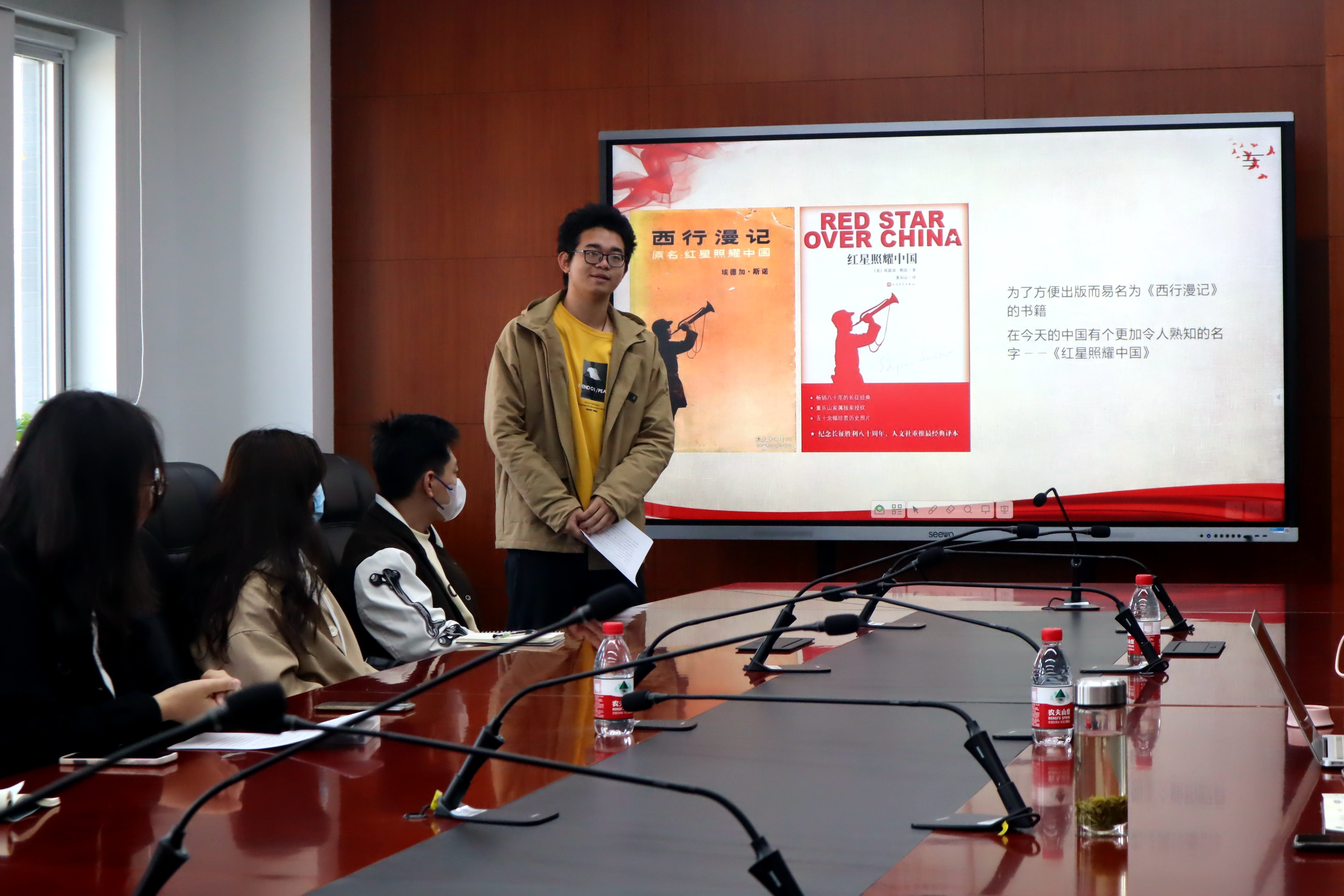 随后三位老师依次进行点评。刘好肯定了三位同学的分享,通过聆听分享感受到精神的鼓舞。针对《红星照耀中国》一书,刘老师表示该书是从他者视角看待早期中国共产党及共产党人的精神面貌、斗争精神和时代使命,对于当前国际社会而言,一方面要讲好中国故事,让世界了解中国避免误解,另一方面也需要更多像斯诺这样来自他者视角的,对中国的真实记录来呈现当代中国的面貌,展现良好的国际形象,加强国际交往。董彪从“读什么”、“怎么读”、“为什么读”三方面,鼓励同学们培养读书的兴趣,加强哲理性和制度上的思考。他表示读书不仅要理解他人,形成共情,读懂作者的想法,也要发现自己,明晰道理。他强调读书要内容与方法并重,用不同的方法论读书会有不同的收获。读书有助于帮助同学们坚定理想信念,强化对制度的深入研究,鼓励同学们多读书、读好书,为中华民族伟大复兴而读书。陈敦副经理通过“乐观”、“激情”、“来之不易”三个关键词,表达了聆听后的感受。陈敦表示党的革命斗争、国家发展富强、社会生活的安全稳定都来之不易,要懂得感恩生活、感谢时代。他鼓励法科生从法律角度回应数字时代的法律挑战,作为当今时代延续建党历史,并表示学院会同同学们一起努力,培养新一代有使命担当的法律人。