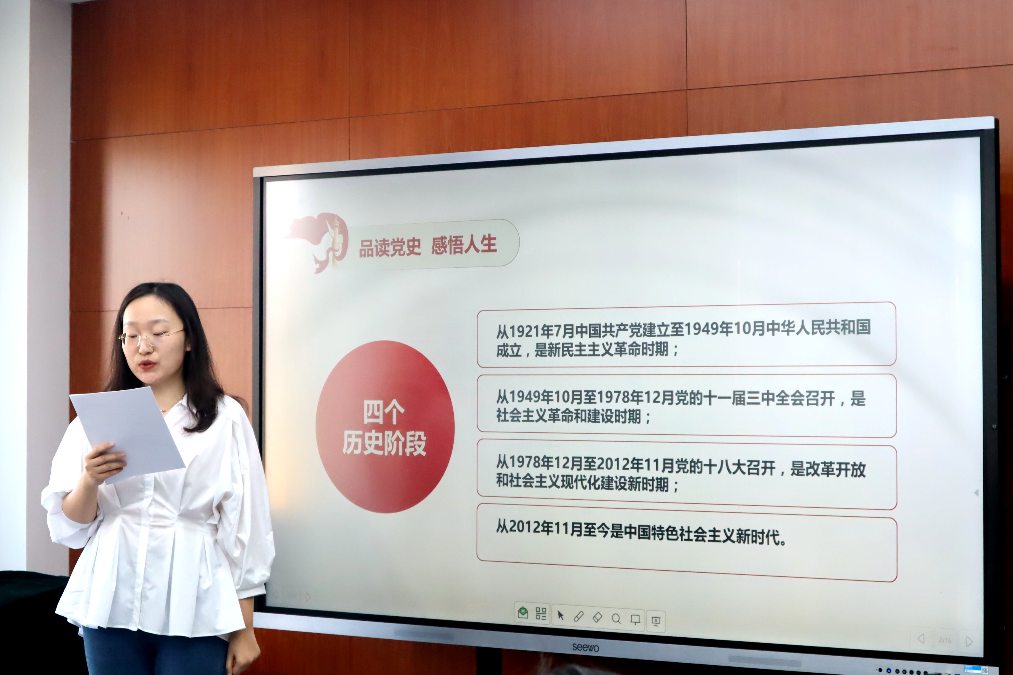 法学214班江丽冰同学分享了《中国共产党党史》的读书感受。她通过梳理中国共产党发展的四个历史阶段,带领同学们回顾了中国共产党百年奋斗的光辉历程和历史性贡献,史论结合,展示了自己对党史的阅读体会。