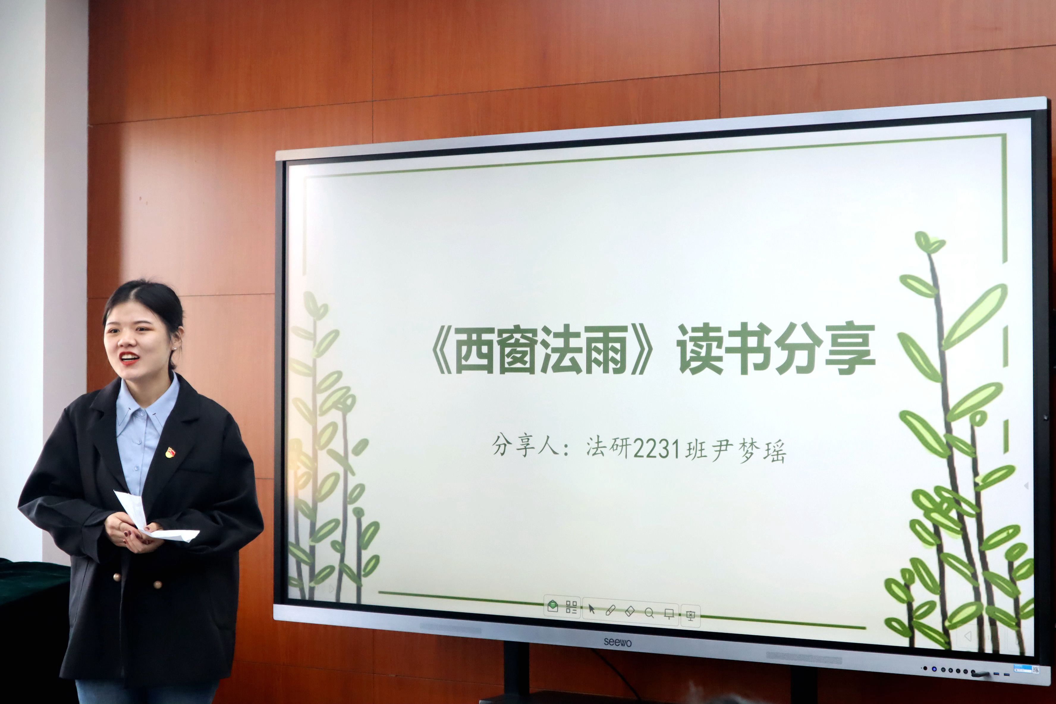 法研2231班尹梦瑶同学分享了《西窗法雨》的所得所感。她通过两个法律故事,分享阅读之后的哲学思辨。她结合当今中国法治发展建设现状,表达了自己对未来法治建设的思考,总结了读书心得,并提出可读性强、浸润性大、阅读体验极佳的推荐理由。
