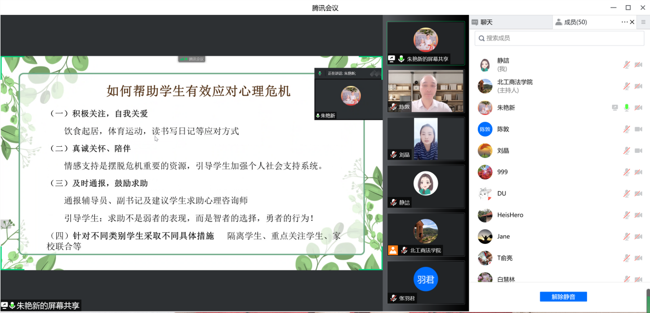 刘晶副书记向各位导师介绍了研究生“云思政”工作落实情况,通报了前期学院摸排的研究生重点关注员工情况,分类别列举了员工产生心理情绪的原因和表现出的心理状态,提醒导师对所指导的研究生心理情绪状态多关注,多引导、多提醒。