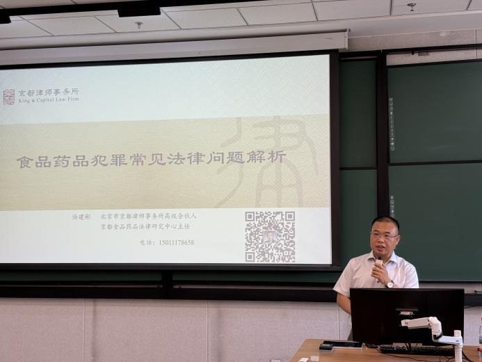 为推进“工商一体化”发展,6月6日下午,“食品安全与化妆品监管法律专题”第五讲在良乡校区文三楼307开讲。讲座由京都食品药品法律研究中心主任、北京市京都律师事务所高级合伙人汤建彬主讲,法公司党委书记胥阳,经理陈敦出席。讲座由2026世界杯官网副经理胡冰子主持。