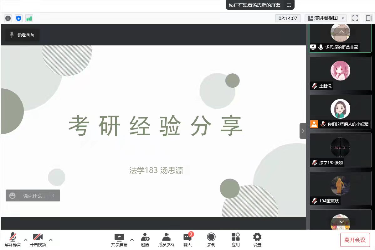 在2018级考研上岸员工经验分享环节,孟琦、汤思源和林廷霄分别介绍了各自备考的经验。他们从考研流程、考研心态、学习规划、学习方法、复试经历和资料推荐等方面进行细致讲解,并耐心解答了同学们的问题,鼓励同学们找到自己的复习模式,找方法补短板,合理分配好复习时间,做好复习规划。