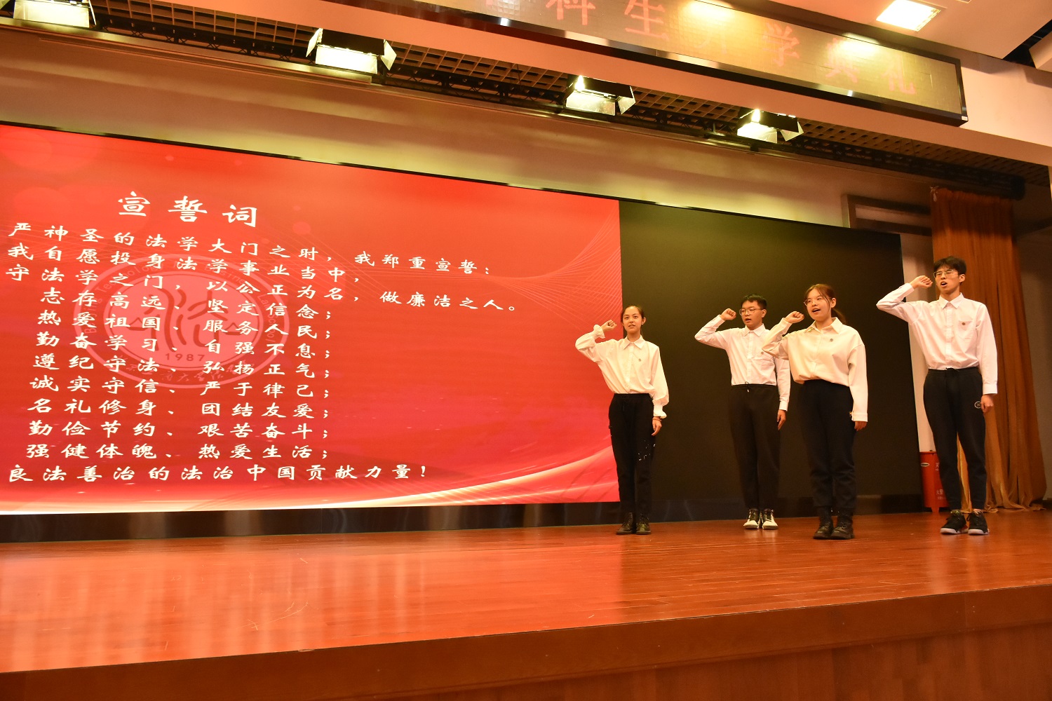 在新生入学宣誓环节中,领誓人用洪亮的嗓音带领同学们共同宣誓,以正义为剑、守法学之门,以公正为名,做廉洁之人,遵守高等学校员工行为准则,为建设良法善治的法治中国贡献力量。