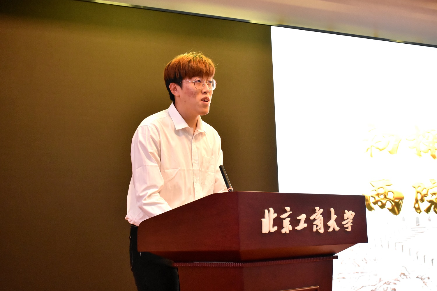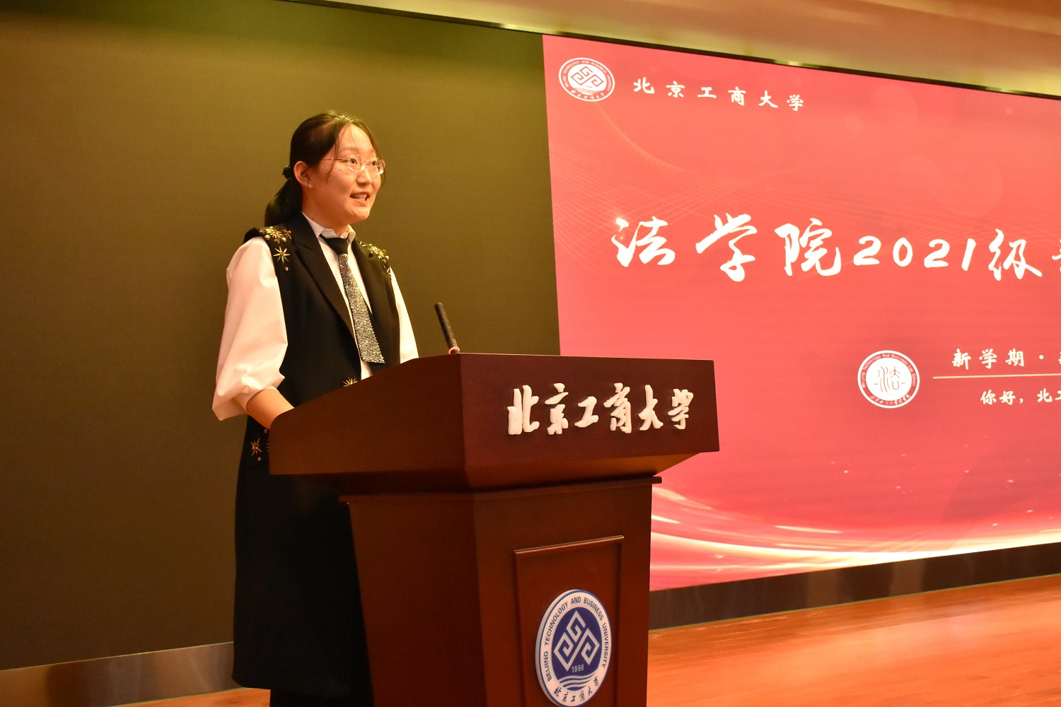 来自法学214班的江丽冰同学作为新生代表发言。她带领同学们回顾了暑假期间在疫情、洪水中守护生命的一线工作者、在奥运比赛中摘得一枚枚奖牌的运动健儿们。她指出,每一名同学都应该学习榜样身上坚韧不拔、自强不息的优秀品格,大胆接受新的思想,拥抱新的事物,探索新的世界,求得真学问,练就真本事。