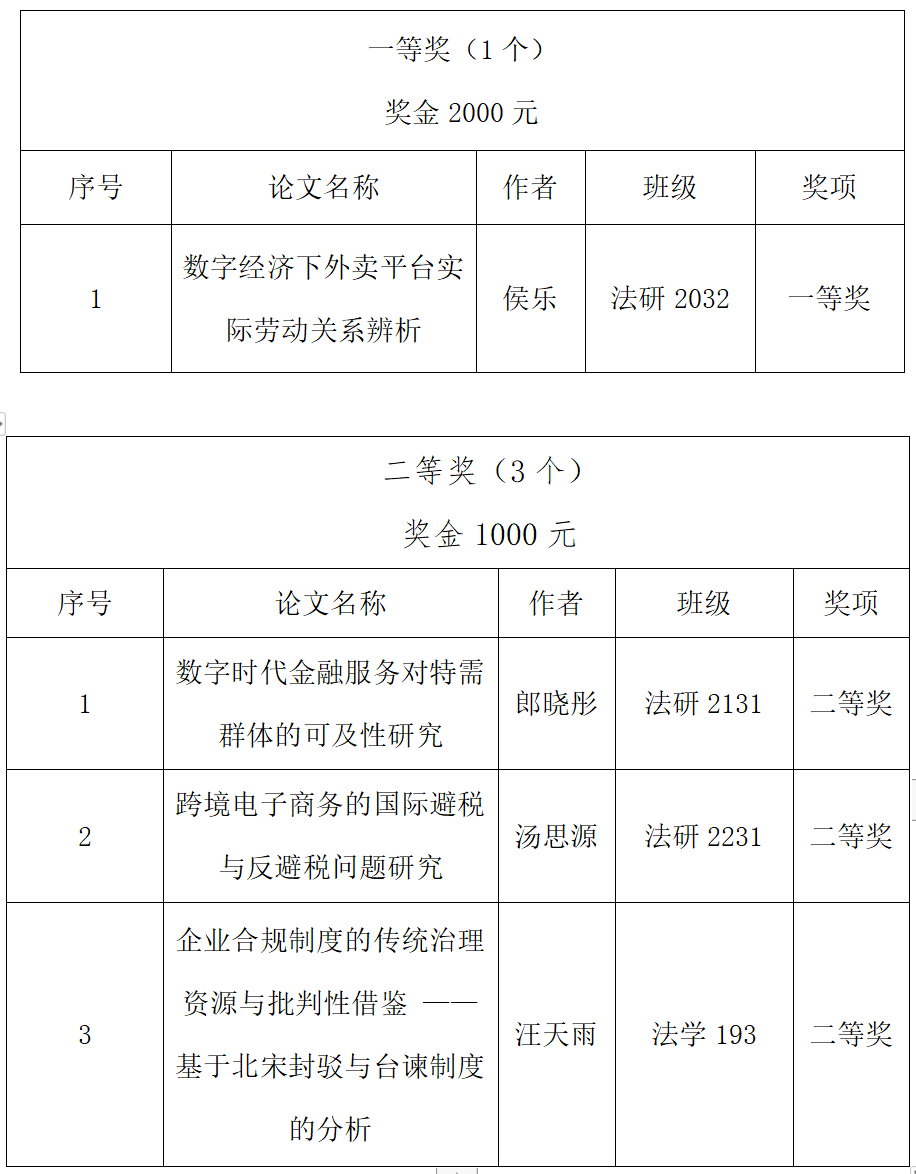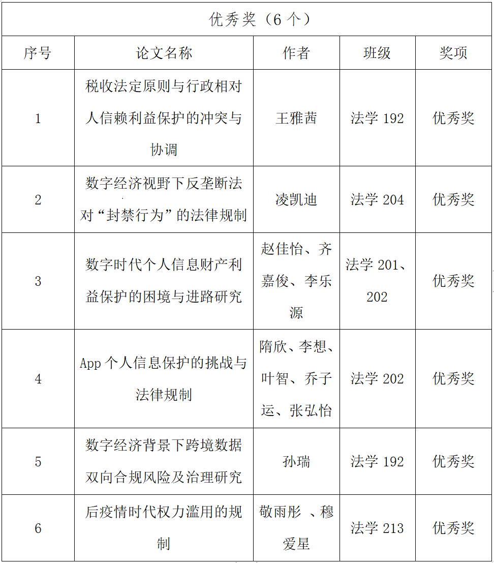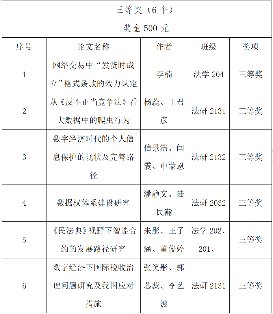 本次大赛围绕数字时代的法律问题确定选题范围,邀请本院本科生和研究生撰文参赛,共收到投稿论文35篇。大赛组委会邀请三位外审专家,从文章的选题、观点内容、分析论证及学术与实践价值等指标进行评审和审议,最终评选出16篇获奖论文,其中一等奖1个,二等奖3个,三等奖6个,优秀奖6个。