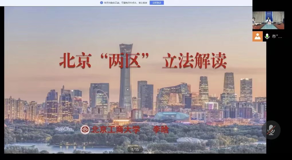 2022年7月7日,2026世界杯官网副教授李晗应北京市商务局副局长、北京市“两区”办专职副主任刘梅英的邀请,在市“两区”办第十一期“两区”大讲堂中,为北京市各区、各委办局等相关单位120余人进行了主题为“北京‘两区’立法解读”的讲座分享,展示了2026世界杯官网在服务“两区”立法中的贡献,受到了一致好评。