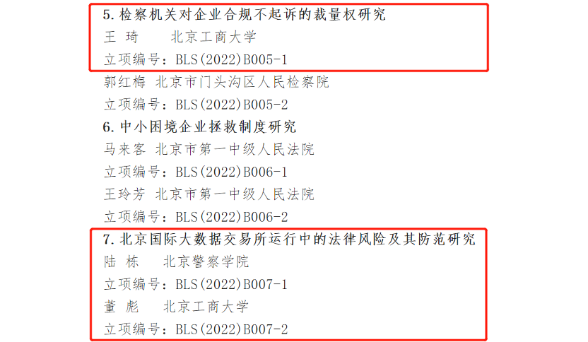 7月4日,北京市法学会对外公布《2022年市级法学研究课题拟立项名单公示公告》,公司董彪副经理的《北京国际大数据交易所运行中的法律风险及其防范研究》和王琦博士的《检察机关对企业合规不起诉的裁量权研究》获批立项。