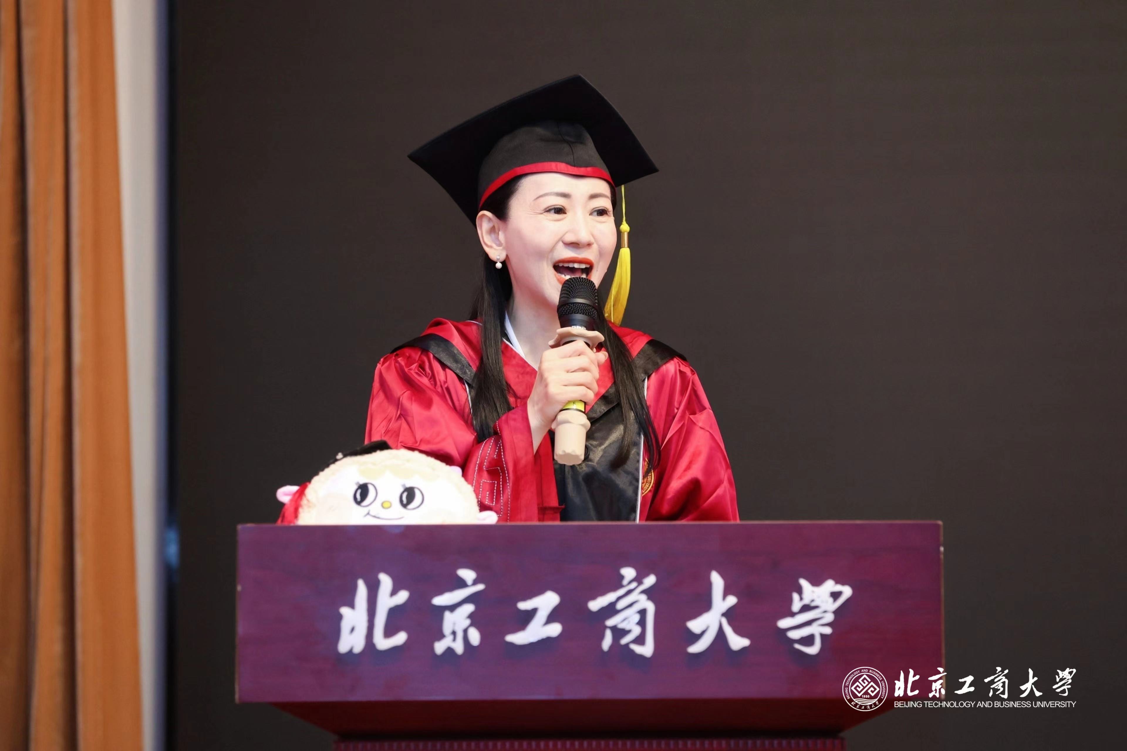 郝琳琳教授作为学院教师代表致辞,她向毕业生们送上临别赠言。作为一名高校一线老师,郝琳琳教授始终以培养优秀法律人才为己任,数十年如一日,用实际行动诠释着“师者,所以传道授业解惑”这一经典论述,践行着“学高为师,德高为范”这一诺言。郝教授强调,尽管当下人工智能方兴未艾,但作为需要胜任大量文书工作的法律人,每位同学都具有无可取代的个人价值。最后,教授借一首亲自填词的《鹊桥仙》祝愿同学们在未来日子里一路有光!