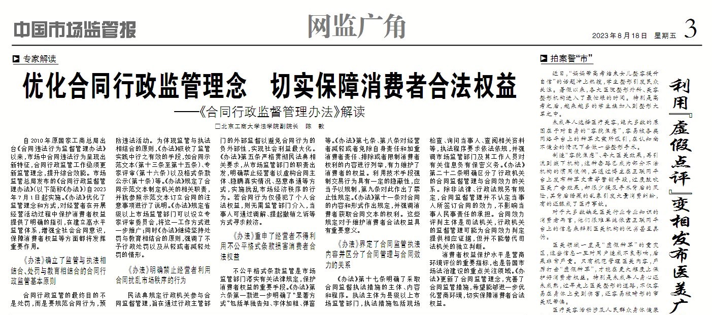 自2010年原国家工商总局出台《合同违法行为监督管理办法》以来,市场中合同违法行为呈现出新特征,合同行政监管工作亟须更新监管理念,提升综合效能。市场监管总局发布的《合同行政监督管理办法》(以下简称《办法》)自2023年7月1日起实施。《办法》优化了监管理念和方式,对经营者在开展经营活动过程中保护消费者权益提供了明确的指引,在建立高水平监管体系,增强全社会合同意识,保障消费者权益等方面都将发挥重要作用。