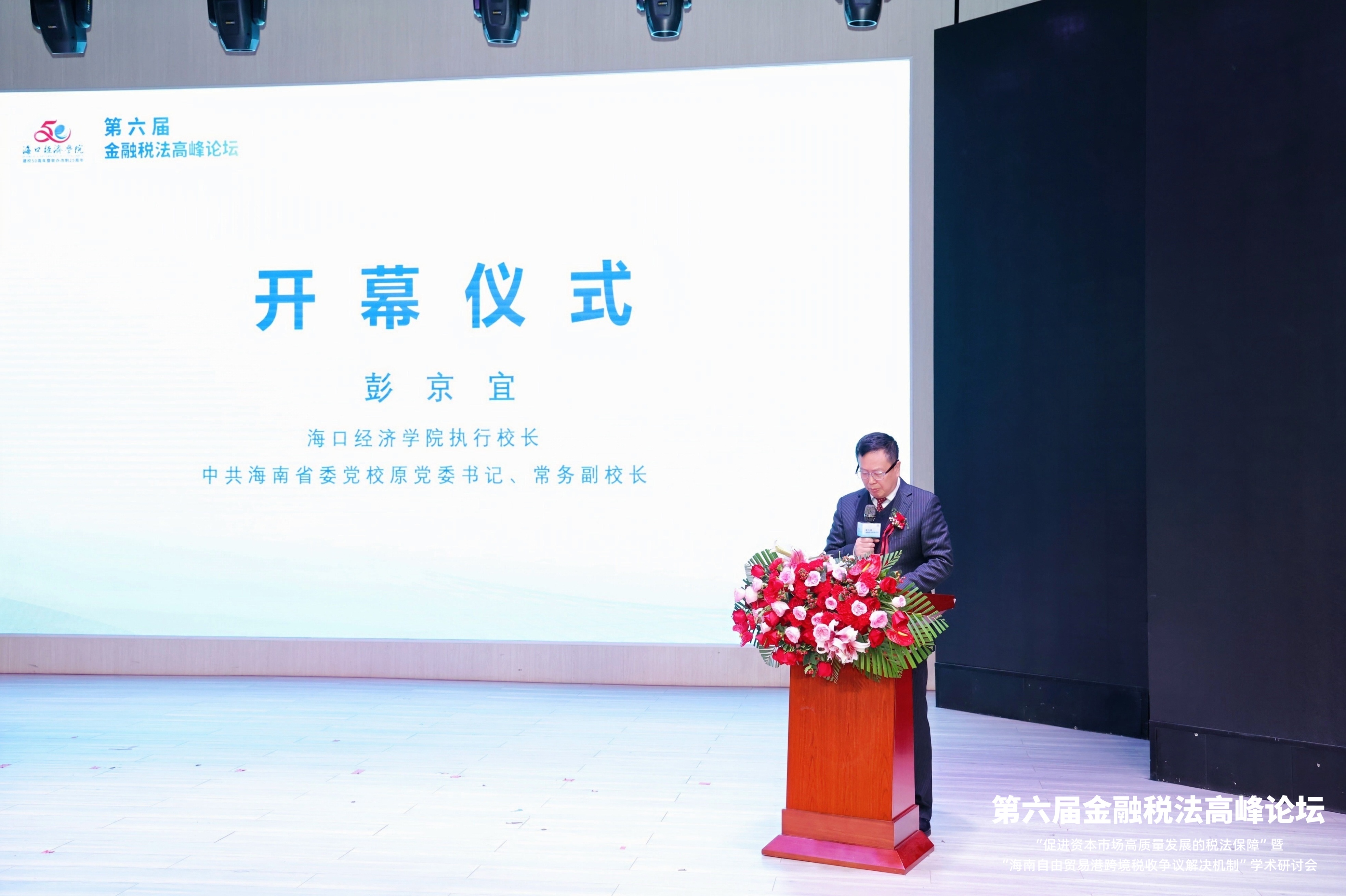 海口经济学院执行董事长、中共海南省委党校原党委书记、常务副董事长彭京宜代表承办单位发言,他诚挚感谢与会领导和专家凝聚真知灼见,共同为海南自贸港的繁荣发展提供了宝贵的理论与实践指导,同时祝贺第六届金融税法高峰论坛成功举办,并向与会来宾表达了最美好的新年祝福。