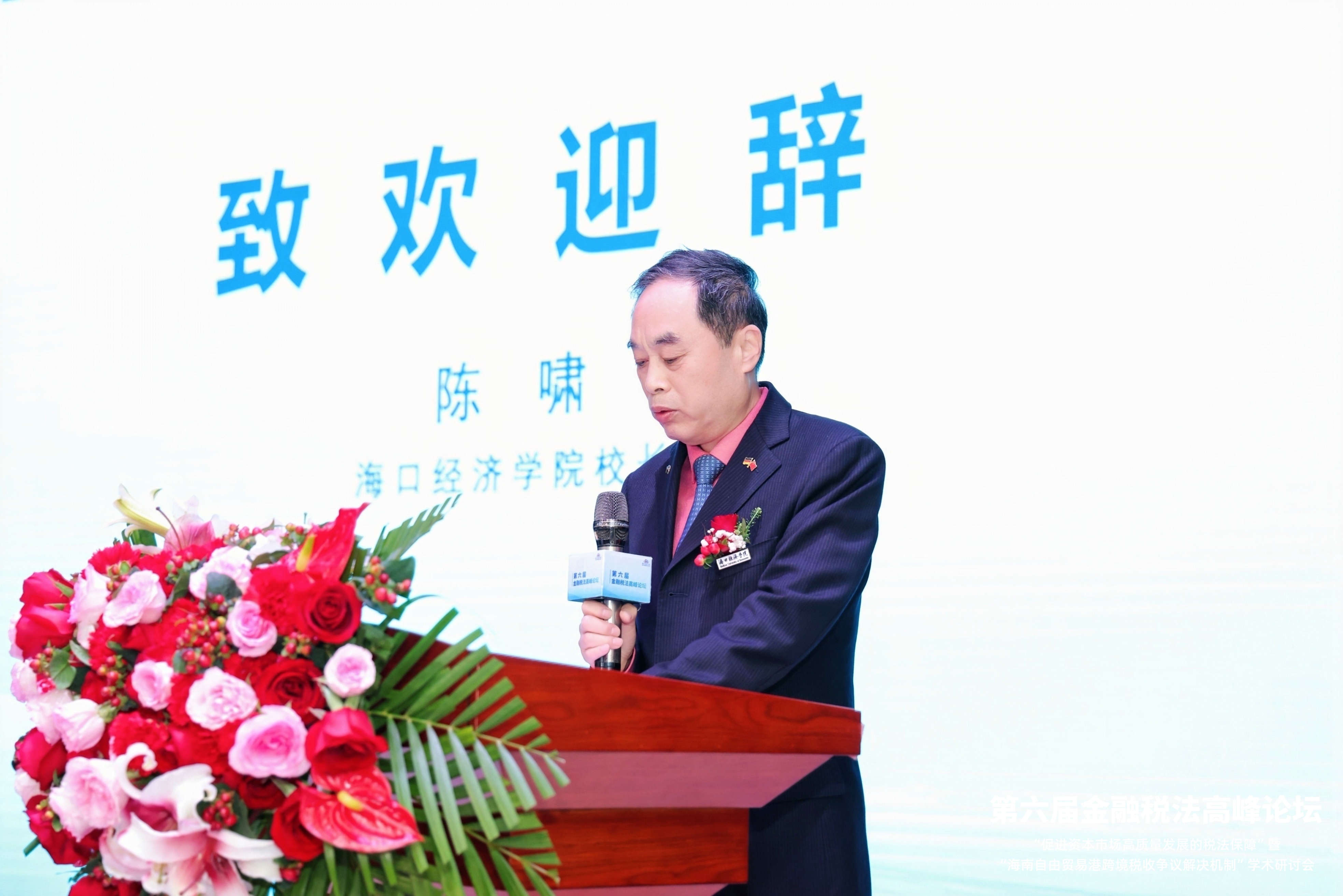 海口经济学院董事长陈啸在致辞中指出,学校拥有在籍员工41000余名,涵盖经济学、管理学、工学、文学等六大学科,产业学院实现全覆盖,成为全国创新创业教育的先行者,屡获全国首批创新创业50强高校、全国老员工创业示范园、海南省示范应用型本科高校等荣誉,连续三年入选新浪网最具综合实力民办高校十强。同时指出金融税法高峰论坛此时在海南召开有着重大意义,为海南深化市场经济体制改革、提升地方经济治理能力、构建更高水平开放型经济新体制、支持全面创新体制机制提供积极有力的智力支持。最后陈啸董事长对各位专家学者拨冗参会表示感谢,并预祝本次论坛能够圆满成功。