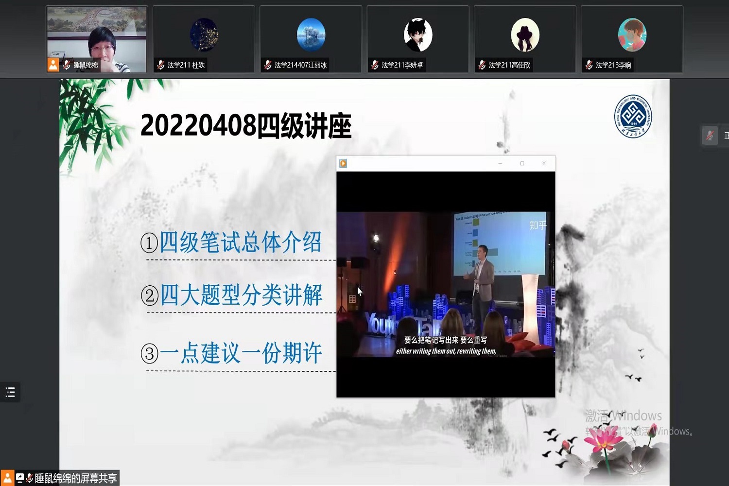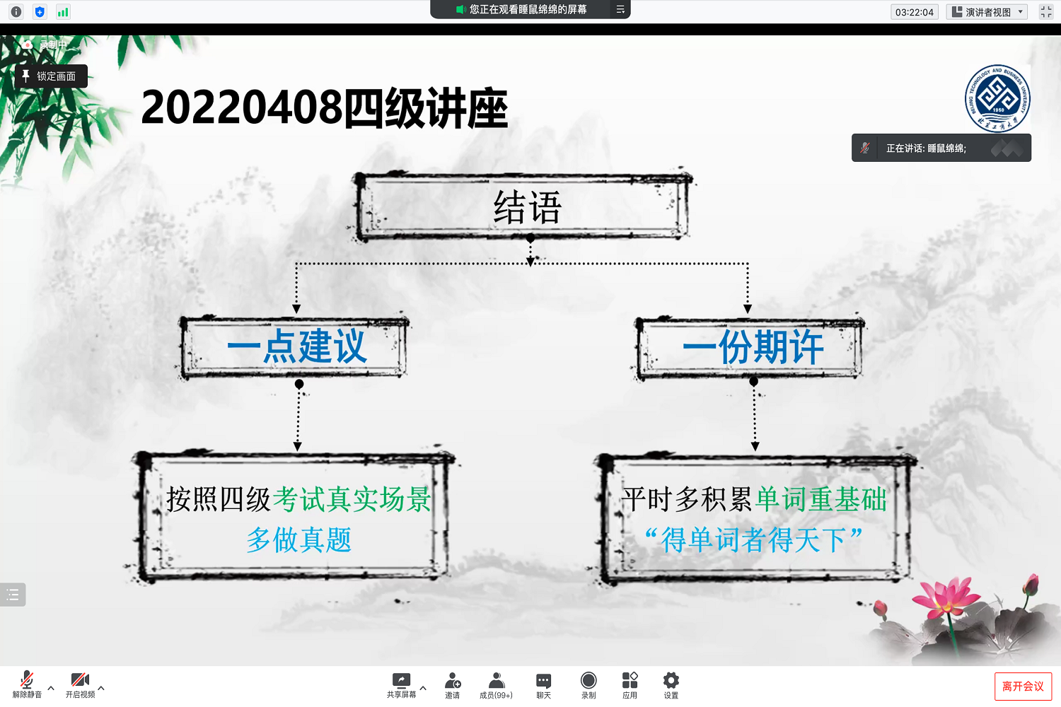 本次大学英语四级考试讲座,从同学们的实际出发,立足于学业发展需求,丰富了同学们的居家学习生活,培养了同学们以积极心态迎考的意识。同学们收益颇丰,更好地掌握了应试技巧策略,对语言学习的整体架构也有了更进一步的理解。
