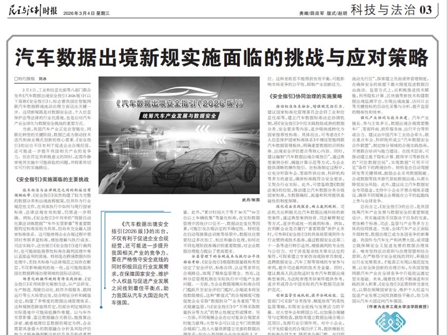 《汽车数据出境安全指引(2026版)》的出台,不仅有利于促进企业合规经营,还可能进一步提升我国相关产业的竞争力。要在严格恪守安全底线的同时积极回应行业发展需求,在保障国家安全、维护个人权益与促进产业发展之间找到最佳平衡点,助力我国从汽车大国迈向汽车强国。