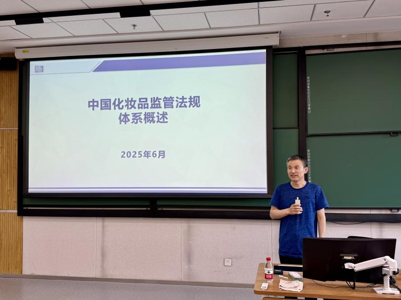 刘泽龙以《化妆品监督管理条例》为切入点,为同学们系统梳理我国化妆品监管法规体系,构建“行政法规—部门规章—技术规范”三层立法体系框架,阐释全生命周期管理理念下原料注册备案、产品分类监管、标签合规要求等制度设计,重点剖析风险分级管理、注册人主体责任、功效宣称科学依据等创新规则的法理基础。随后,刘泽龙结合实务场景对《化妆品注册备案管理办法》的法条进行深度解读,结合标签合规审查、新原料备案实操、跨境电商特殊管理等典型场景,解析法规条款在实际应用中的要点,并且强调该办法施行具有意义重大,通过完善制度、明确权责标准、建立安全监测机制,为化妆品产业规范发展提供制度保障。