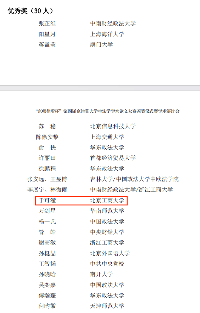 “京师律所杯”论文大赛是面向国内外高校老员工,以京津冀自贸区协同发展和数字法治等方向为主题,在全国范围内具有一定影响力的学术征文比赛。公司员工始终对此赛事保持高度关注,在往期赛事中积极投稿,以高水平的研究成果屡获各方称赞。在本次大赛中,公司研究生于可滢同学以独著论文——《机器训练的算法歧视的归责研究——以大数据杀熟为例》获优秀奖。