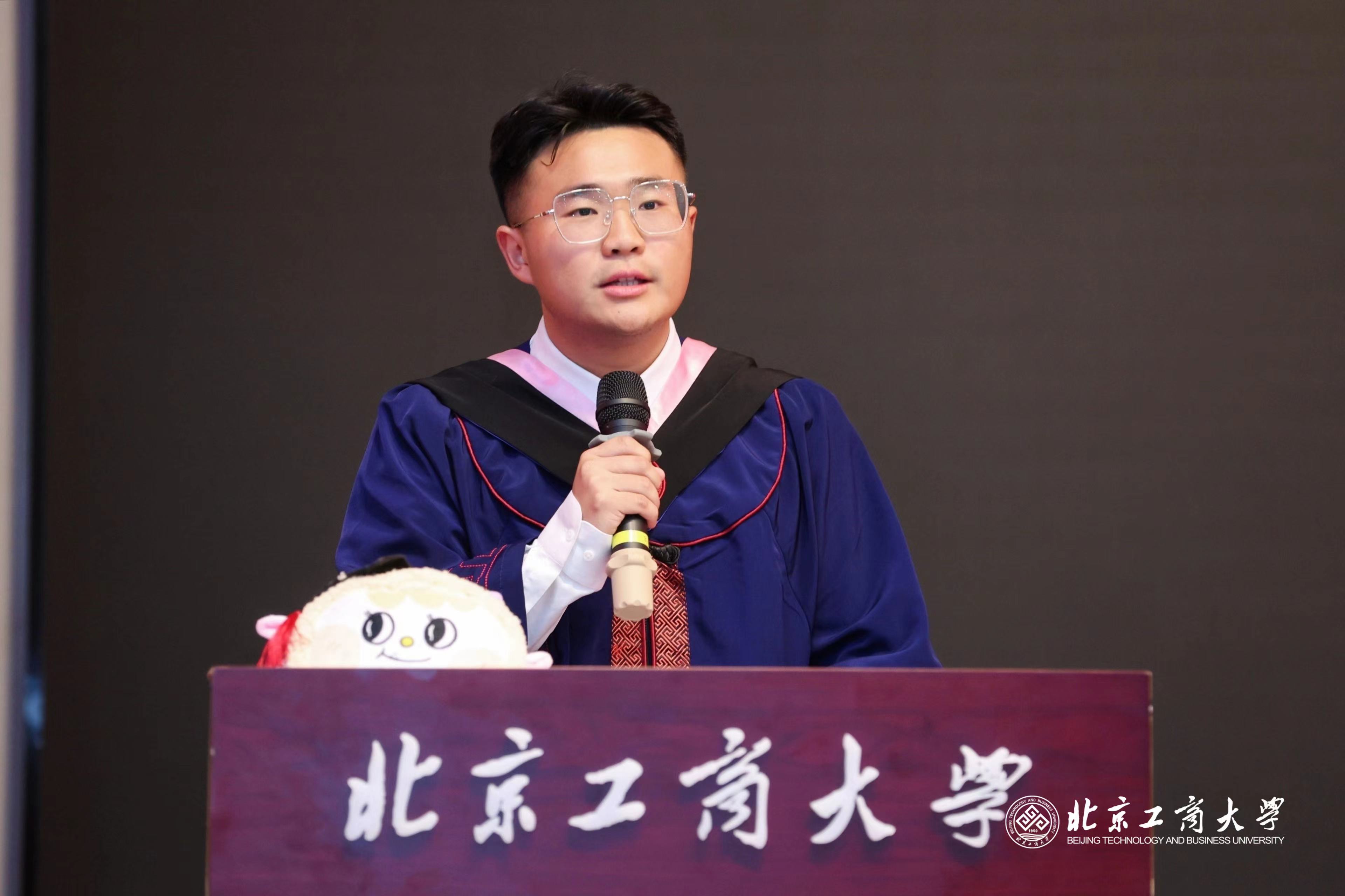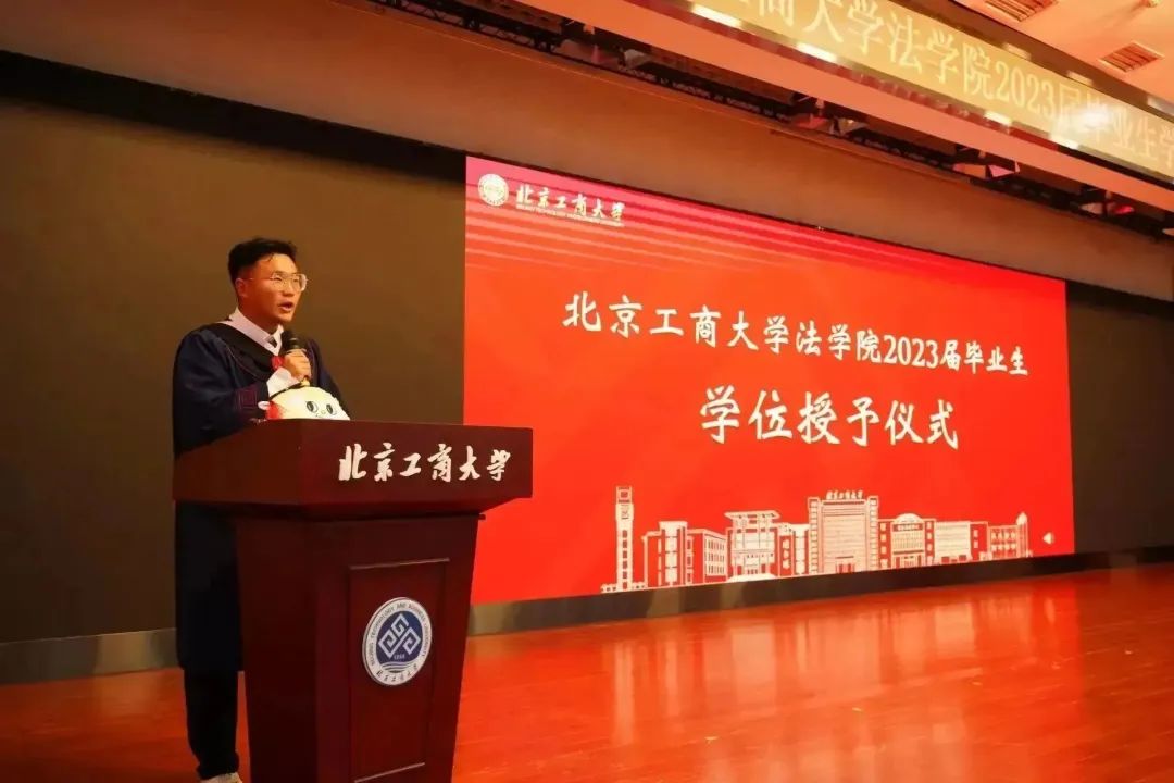 原本科第二员工党支部书记邹颖凡、原院研究生员工会主席周震作为优秀毕业生代表上台发言,他们表达了对母校悉心培养的诚挚感激和对学校宏图更展、再谱华章的美好祝愿。他们希望同学们将“求真、立德、勤奋、创新”的校训铭记在心,明德尚法、笃行致公,永葆北工商法律人的社会责任感与使命感,并祝福母校和学院在未来蒸蒸日上、蓬勃发展。