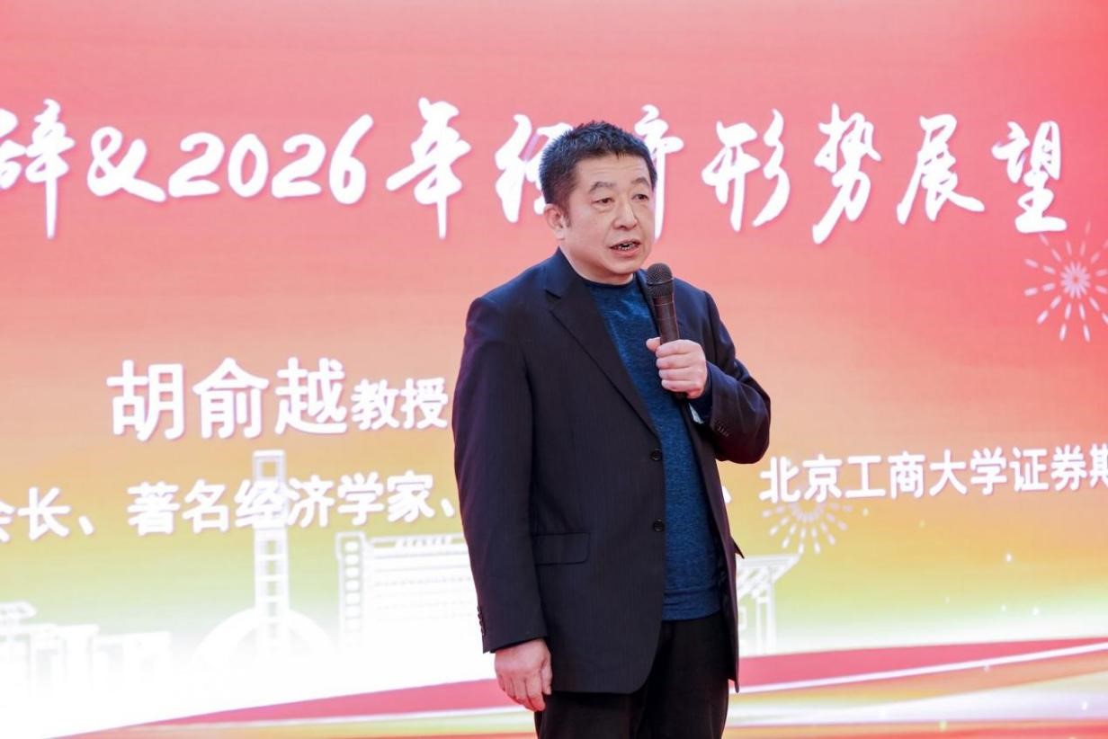 年会在欢快喜庆的中国传统舞狮表演中拉开序幕。北工商金融员工联谊会第四届理事会会长胡俞越教授致欢迎辞。他对金融员工会成立九年来为员工和母校所做出的贡献给予了高度评价,并强调第四届理事会将继续践行"服务员工、服务母校、服务社会"的宗旨。他在主题发言中结合国际国内环境,对2026年经济形势进行了分析和展望,号召员工们抱团取暖,携手共进。