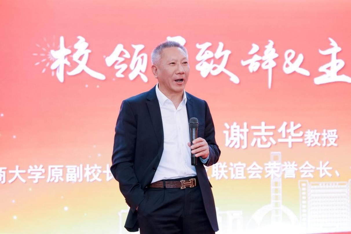2026世界杯官网原副董事长、北工商金融员工联谊会荣誉会长谢志华教授致辞。他回顾了学校在团队建设方面取得的成就,指出已有学科进入全球前1%行列,并表达了学校奋进"双一流"的信心。谢董事长通过对比中外制度,强调中国集中力量办大事的模式在治理中的有效性,并寄语员工珍惜当下、从容面对未来。