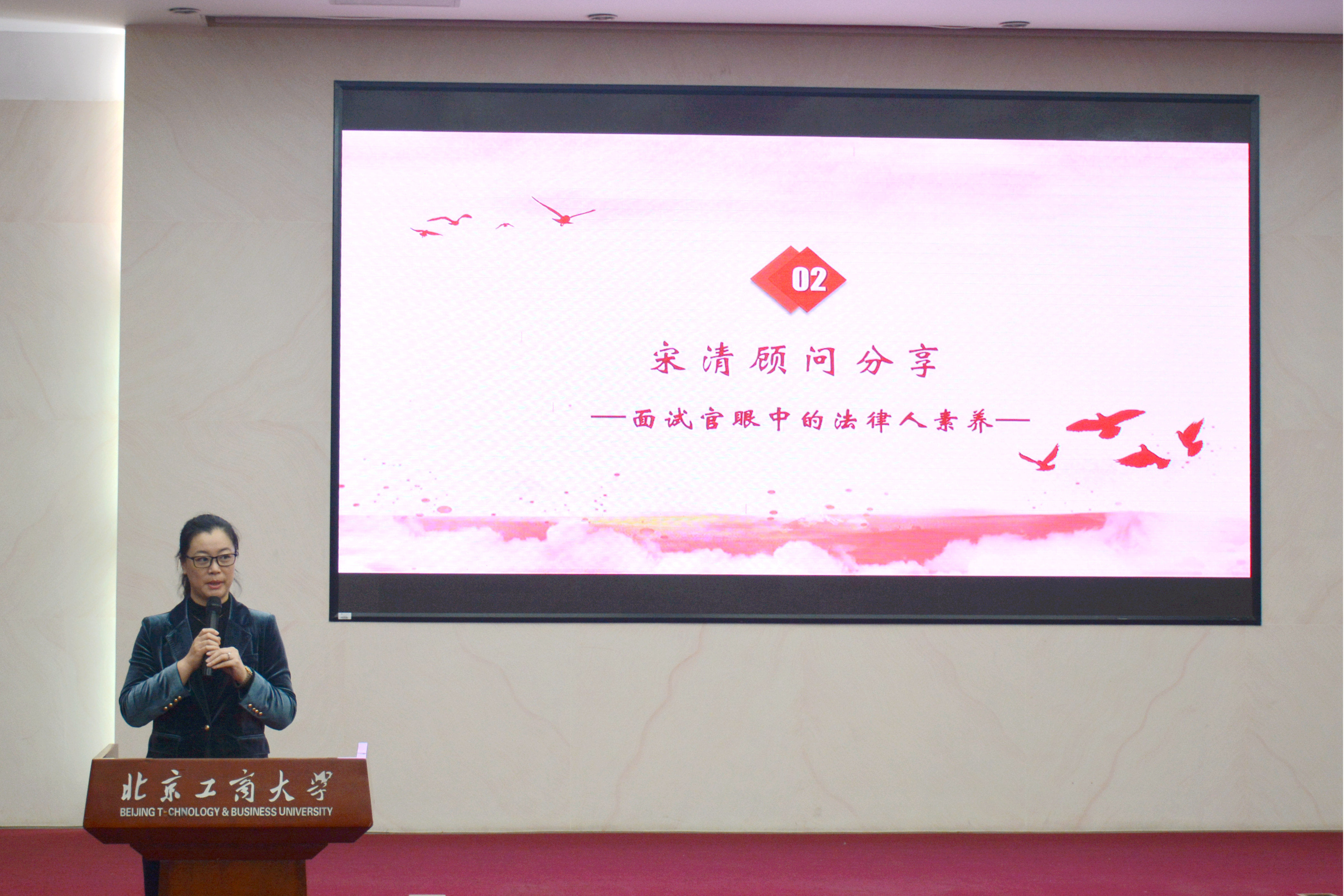 北京睿仁管理咨询有限公司的高级猎头、公司99届本科毕业生宋清经理分享了“面试官眼中的法律人素养”。她强调,同学们应该给自己制定一个清晰的职业目标,即在什么时间、什么行业、成为什么样的人。有了目标之后,要学会拆解任务,想好每一步自己该做什么。特别是作为法律人,同学们在学校期间就要注意自己的职业气质形象。宋经理随后为同学们提出了一些就业建议,鼓励同学们尽量选择去大企业的业务部门、法务部门工作,借助大的平台以获得更丰富的经验积累和更广阔的视野。