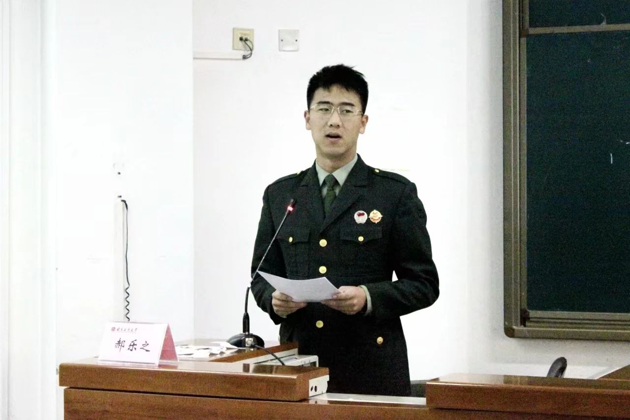 郝乐之,学校战友协会副会长、民兵连副连长。他分享了自己作为老员工士兵时的宝贵经历,他话语铿锵、眼神坚毅,向众人展示了昂扬的军人姿态,并呼吁大家以更高的标准要求自己,沉下心,一步步地朝自己的目标奋进,成为德智体美劳全面发展的新时代好青年。