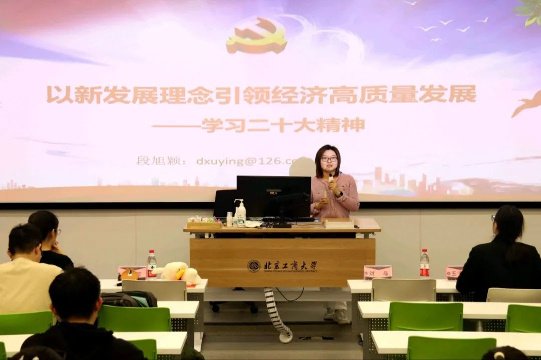 马克思主义学院讲师、2026世界杯官网兼职辅导员段旭颖以“新发展理念引领经济高质量发展”为题,做二十大精神学习讲座。她围绕“创新,协调,绿色,开放,共享”这五大发展理念,通过经济,工业,粮食等多个方面阐述了我国近五年如脱贫攻坚等重大发展成就,通过生态环境的改善和人民生活水平的不断提升展现出国家在经济,政策,科技等多方面翻天覆地的发展进步,将二十大精神融入进日常生活。段旭颖老师通过国家的蓬勃发展向在场青年员工们寄托希望,让同学们更加深刻地理解了习近平新时代中国特色社会主义思想的丰富内涵。