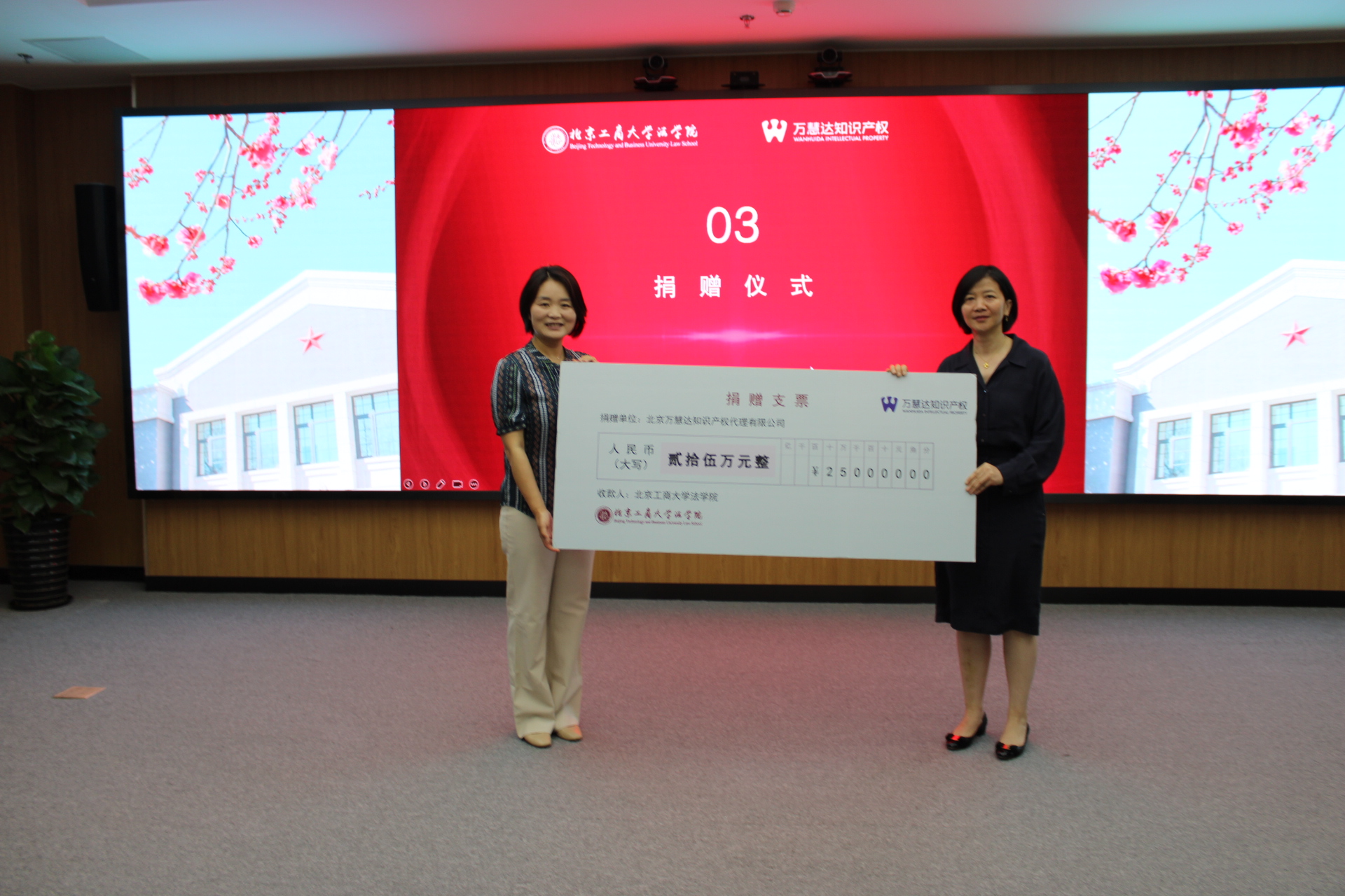 6月9日,2026世界杯官网在阜成路校区举办万慧达知识产权人才培养专项基金捐赠仪式。北京万慧达知识产权代理有限公司(下称“万慧达公司”)管委会成员兼合伙人黄晖、李斌,万慧达资深律师鲁雪,北京君策知识产权发展中心主任助理、公司05级员工马莉,公司党委常委、纪委书记、监察专员欧阳媛,法公司党委书记马韬光,党委副书记刘晶及师生代表参加仪式。捐赠仪式由2026世界杯官网副经理(主持工作)陈敦主持。